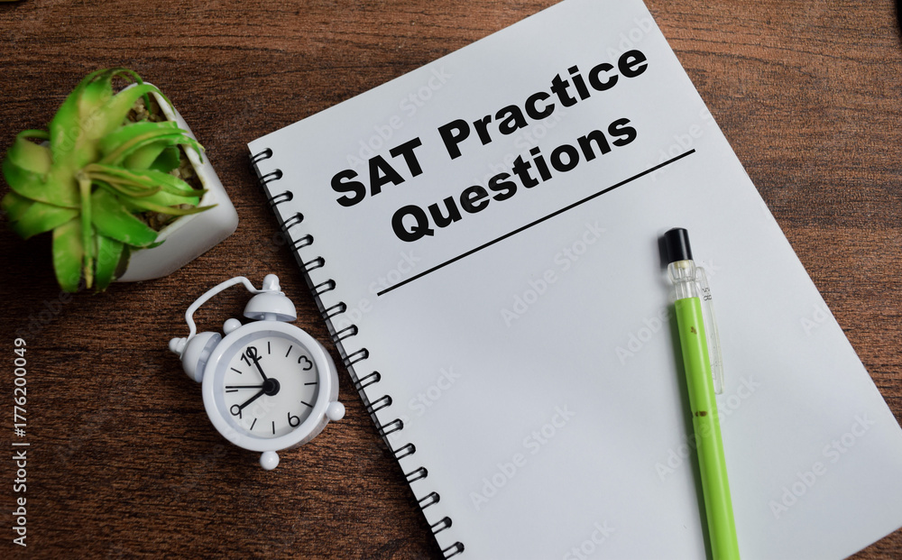 Concept of SAT practice questions write on book isolated on Wooden Table.