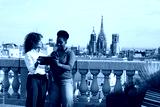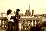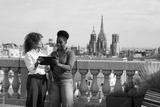 Coworkers discussing business on barcelona rooftop with tablet