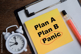 Concept of panic red circle below plan A and plan B write on sticky notes isolated on Wooden Table.