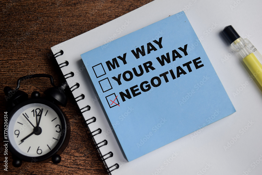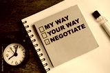 Concept of negotiate and compromised related check boxes write on sticky notes isolated on Wooden Table.
