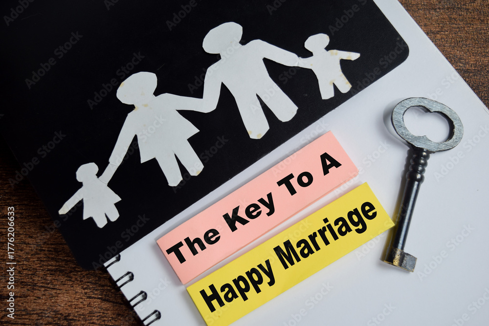 Concept of the key to a happy marriage write on sticky notes isolated on Wooden Table.