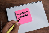 Concept of fachkraft gesucht in German it means specialist wanted write on sticky notes isolated on Wooden Table.