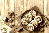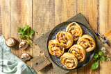 Puff pastry rolls with mushroom and cheese filling on rustic background. Top view.