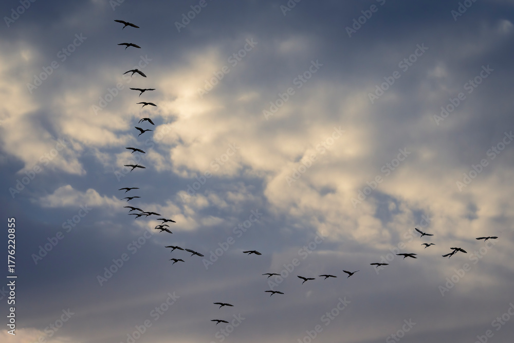 Silhouettes of a flock of African sacred ibis (Threskiornis aethiopicus) flying in curved formation against a moody, cloudy sky at dusk. Cape Town, Western Cape, South Africa. Wildlife in flight.