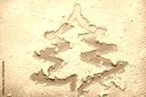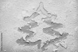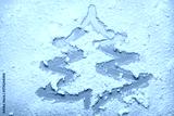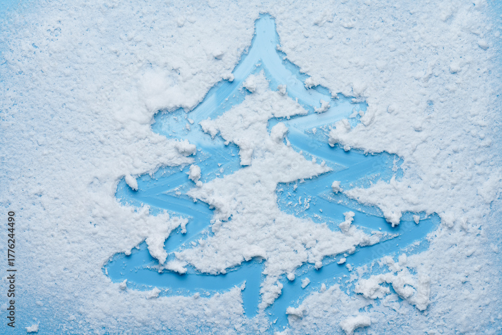Christmas tree shape drawn in snow on a blue background. Creative winter holiday concept with a snowy texture