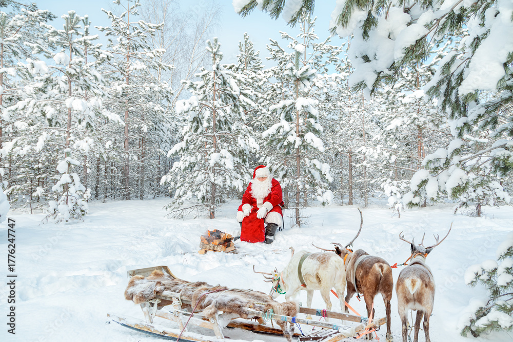Authentic Santa Claus with a reindeer and a bag of gifts sits by a fire in a snowy forest.