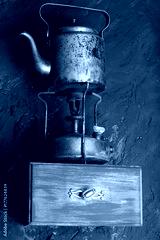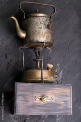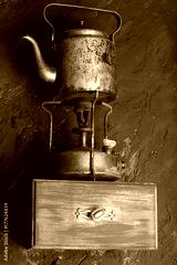 Vintage metallic kettle on a shelf.