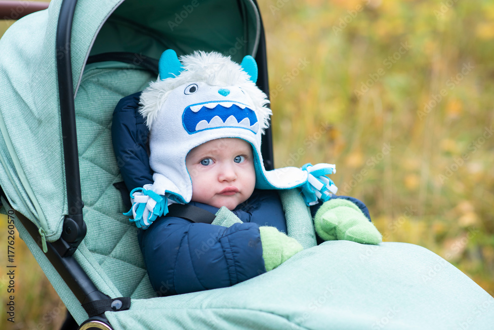 A baby boy wearing a white monster hat, jacket, and mittens sits in a green stroller in a park. The child is 10 months old.