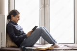 Smiling young female student using phone sitting at home windowsill