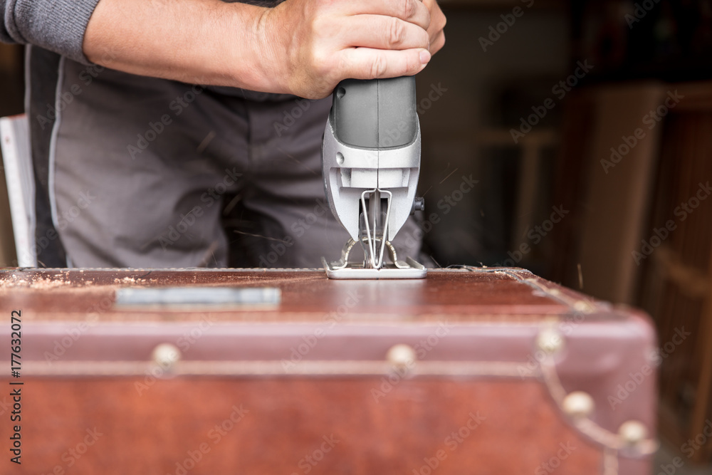 Mann sägt mit der Stichsäge einen Ausschnitt in einen Koffer