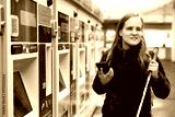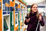 Visually impaired woman with white cane and smartphone standing at trains station and buying trains ticket