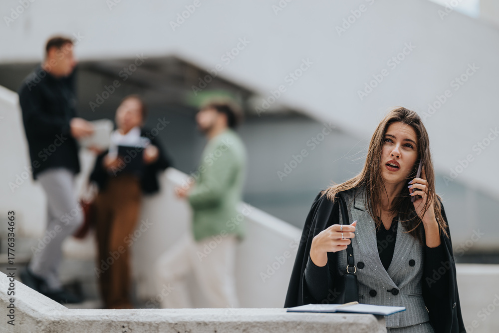 A professional woman stands at a stairwell talking on her phone, with coworkers blurred in the background. The scene portrays office life, communication, and on-the-go work.
