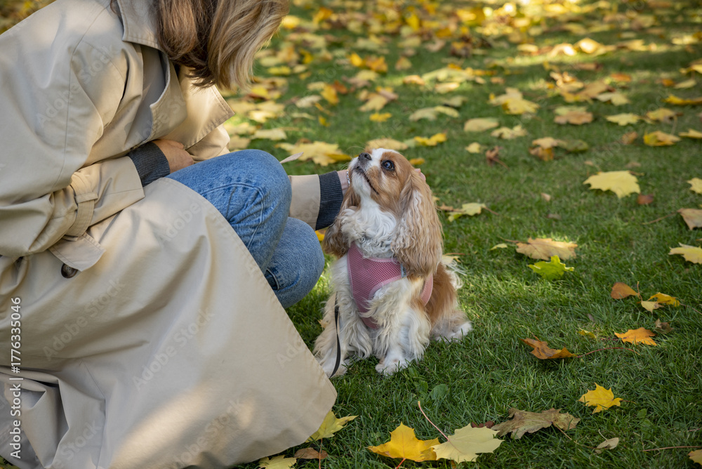 Woman with her cute spaniel puppy in grass around yellow leaves in an autumn day
