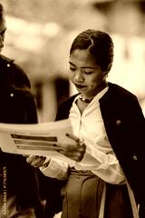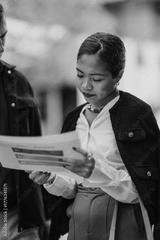 A woman in smart attire reads a document outdoors, possibly during a business meeting or collaboration. The scene emphasizes focus, teamwork, and professional style with confident posture.