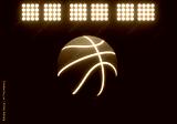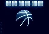 Blue basketball with bright blue glowing neon lines in under illuminated floodlights