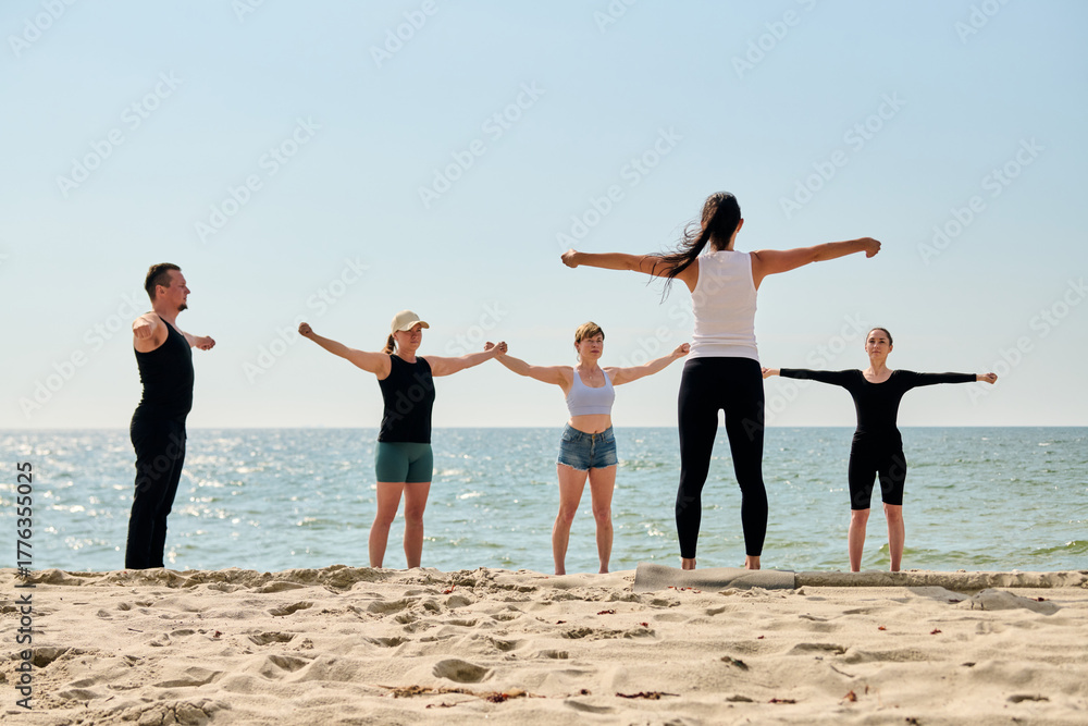 Yoga coach leading group yoga practice on Sandy Beach by Baltic Sea