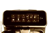 Close-up of espresso machine control panel with touchscreen interface. Multiple beverage options displayed for easy use.