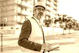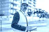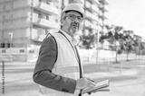 Construction engineer inspecting building site with worried expression