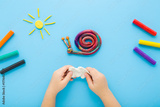 Little child hands making and creating snail and sun from colorful modeling clay on light blue table background. Pastel color. Closeup. Point of view shot. Top down view.