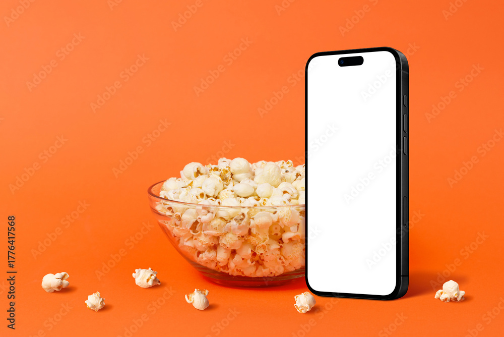Minimalist smartphone mockup standing beside bowl of popcorn on orange background, ideal for movie night, food branding, or streaming concept imagery
