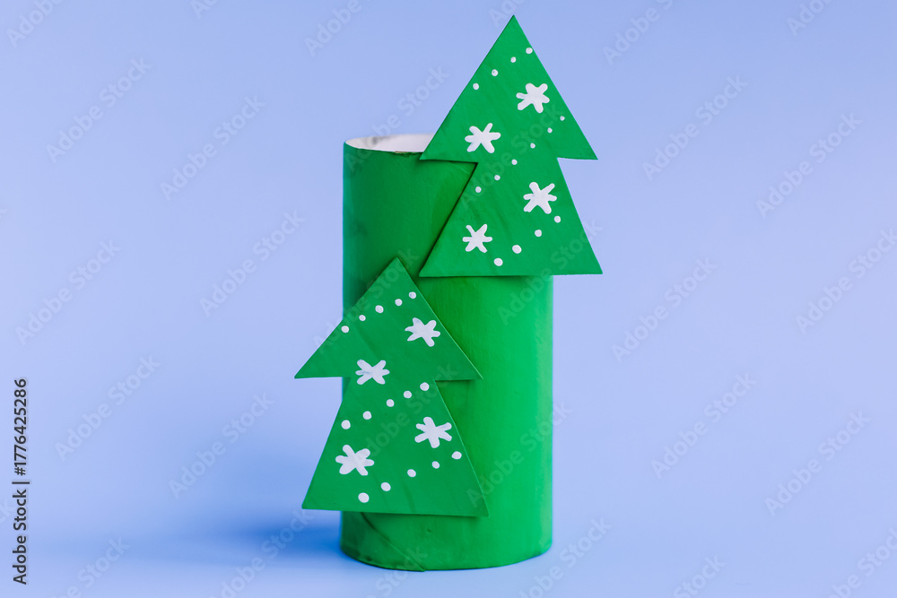 Christmas toy from toilet tube roll, paper toy santa claus, snowman, reindeer, tree rabbit on yellow background. Holiday easy kids DIY, decoration idea for winter season, home party. Children's crafts