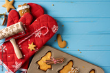 Festive kitchen top view scene featuring red quilted mitts, cookies, candy canes, rolling pin, and cookie cutter. Warmth, joy, and holiday flavor evoke Christmas and New Year celebration