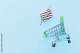 Supermarket trolley, shopping toy cart with gift, flat lay, top view, mock up. Christmas, New year, st Valentine's day sale, online shopping concept