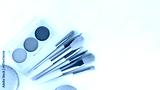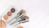 Flat lay of beauty accessories and pastel macarons, 16:9 composition.
