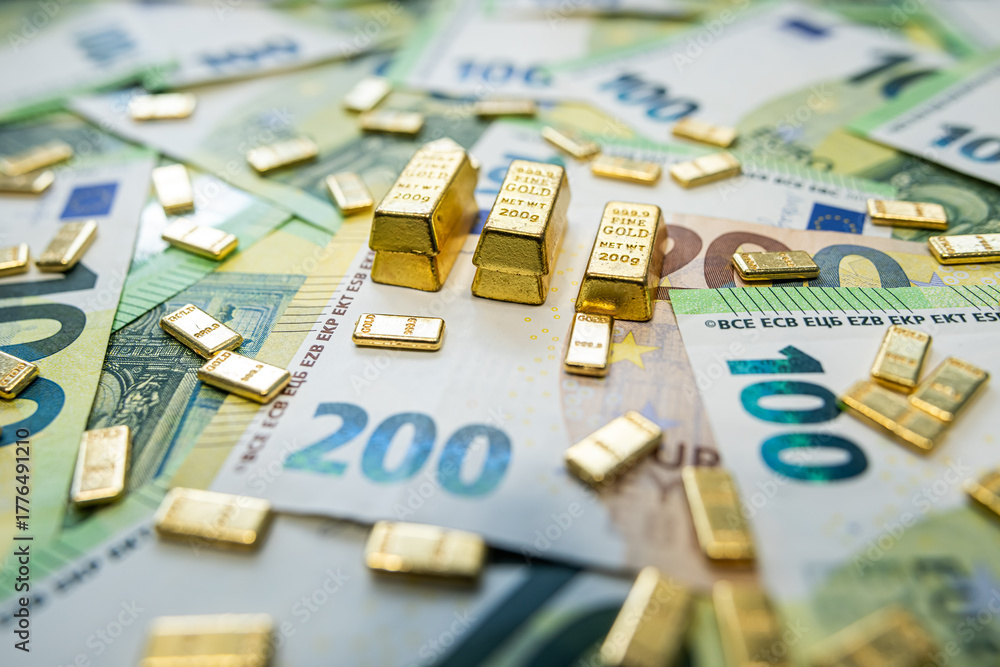 Gold bullion bars with euro cash, concept of rich lifestyle, financial independence and prosperity