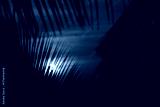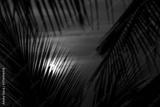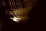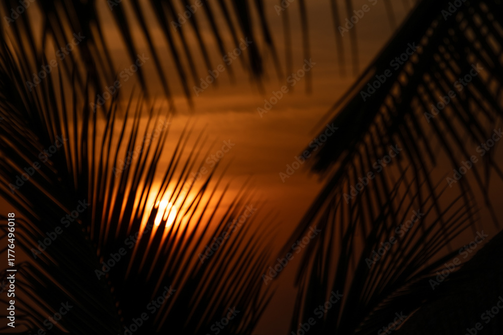 A tropical sunset, seen through the fronds of the exotic palm tree. The sky is a deep, burnt Orange
