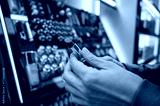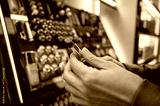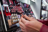 Woman buying make up at cosmetics section in store. Customer shopping beauty products. Choosing lipstick from shelf and selection. Using tester.