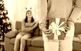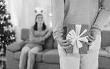 Christmas couple sharing gift at cozy home. A man hides a present behind back, planning a holiday surprise as his partner waits on sofa near festive tree. Celebration and congratulations concept.