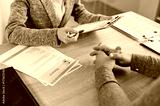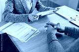 Interview recruitment in office manager meets candidate. HR manager checks documents, noting experience and fit, and discusses eligibility with applicant job seeker. Hiring and employee recruit.
