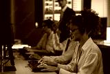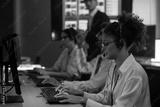 Diverse team of professionals customer service agent wearing headsets and monitoring computer working in dark control room. Female support and assistance call center at night in modern office.