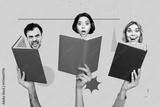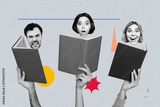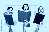 Full banner image 3d collage of shocked angry happy girls man head face expression peek bodyless book encyclopedia reader hand
