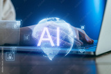 Technology trends in artificial intelligence with digital visuals over a laptop at night