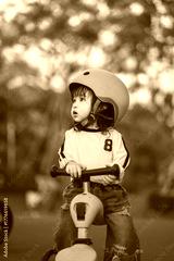 Cute little child wearing helmet riding small tricycle scooter in outdoor park, toddler playing and learning balance in natural, family lifestyle childhood development concept with safety awareness