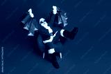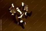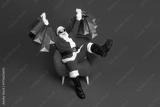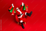 Santa Claus in a red suit sits in a chair waving with colorful shopping bags against a bright red background