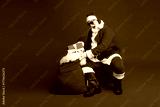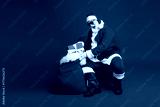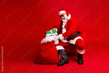 Santa in red costume presents a green gift to a friend on a red background with bag and beard in a festive holiday scene