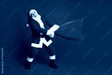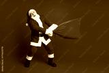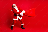 Santa with large red sack strikes a playful pose in a bold red studio creating a festive holiday mood