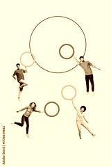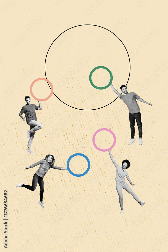 Sketch art creative vertical photo collage of three happy business partners girls guy stand circle puzzle development growth