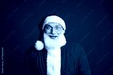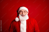 Happy Santa in a traditional red suit with a white beard and glasses smiles warmly against a bold red backdrop perfect for Christmas campaigns and festive promotions