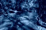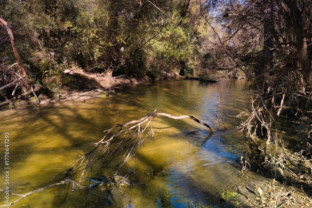 Nature reflects in calm waters of a serene creek in the woods during a sunny afternoon