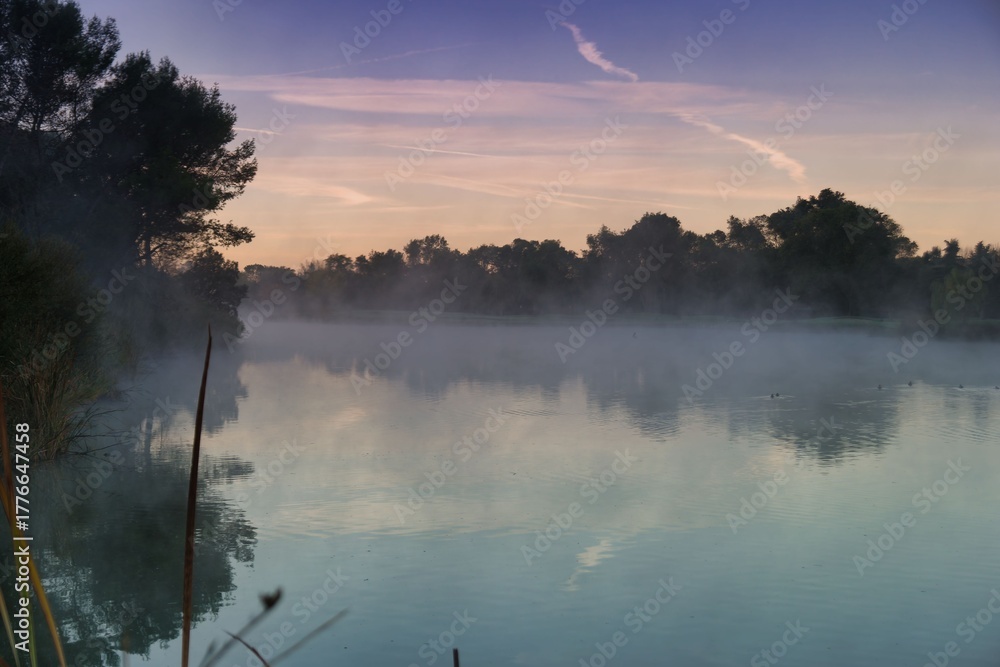 Morning mist covers a serene river landscape in the early hours surrounded by trees and calm water