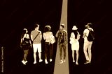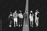 Composite photo collage of three hikers girls guy walk travel tour wanderlust adventure carry bag tourism isolated on painted background