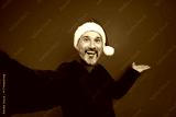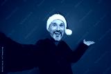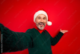 Playful Santa selfie with a happy man wearing a green sweater stands against a bold red background spreading Christmas cheer and holiday joy for a festive stock image