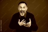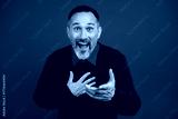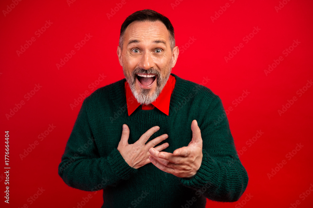 Funny excited man in green sweater smiles and reaches out against red christmas background full of holiday energy and warmth