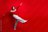 Joyful woman wearing a red christmas sweater kicks with arms outstretched against a bold red background in a festive fashion stock photo