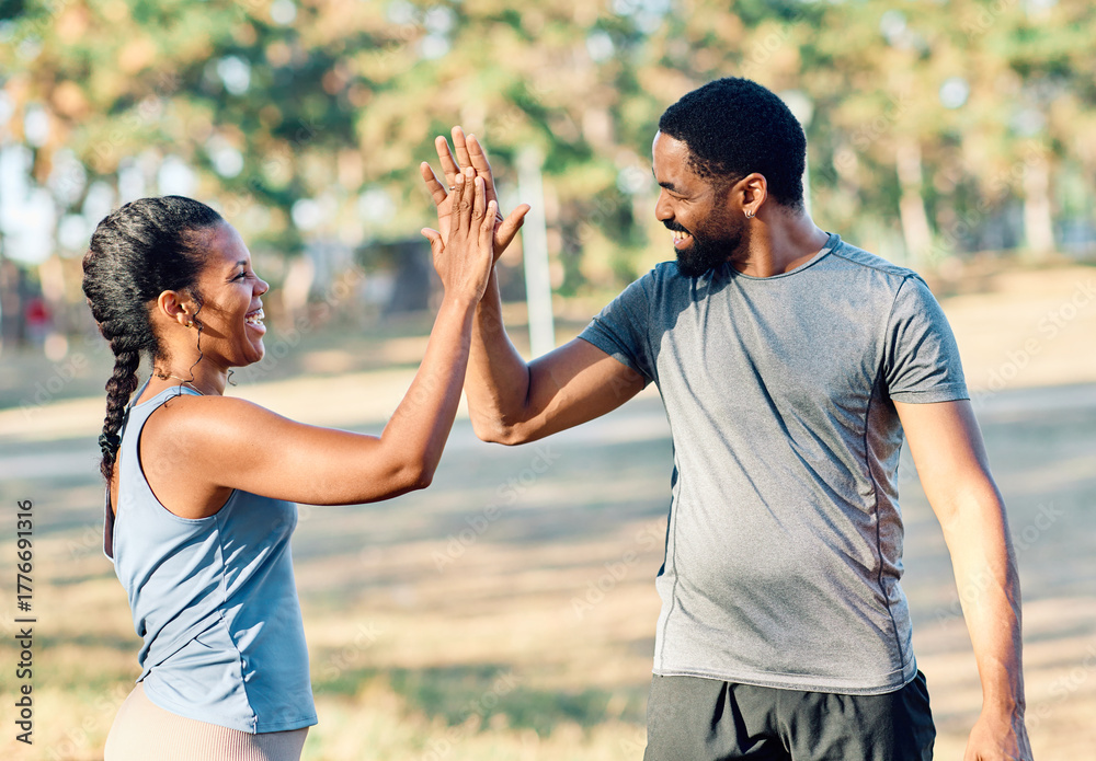 Smiling active young couple jogging exercising and having fun and laughing together taking a break after walking and running in the park, high five exchange