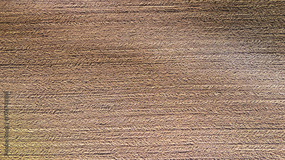 Close-up view of textured earth surface with distinct patterns created by farming equipment, showcasing the rich brown soil in an agricultural field.